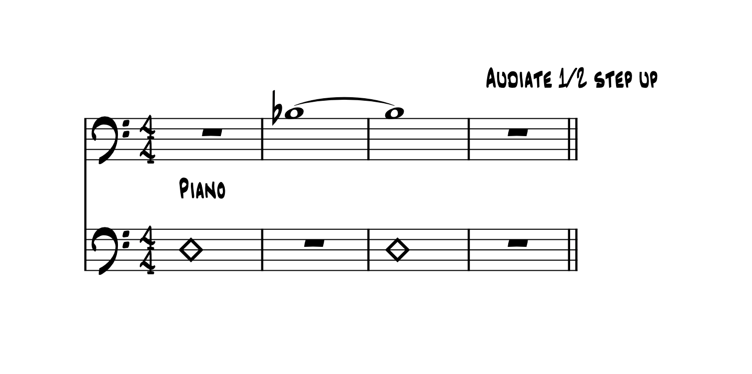The basic exercise layout for every PCE begins with a four beat click to set the tempo, followed by a piano tone to set the target note. The following measure is meant for your tone production alone, followed by the piano tone (Unison exercises) or tones (all other chord based exercises) where you can listen and adjust if needed. The next four beats should be used to audiate the next pitch, 1/2 step above (ascending tracks) or below (descending tracks) the last pitch.